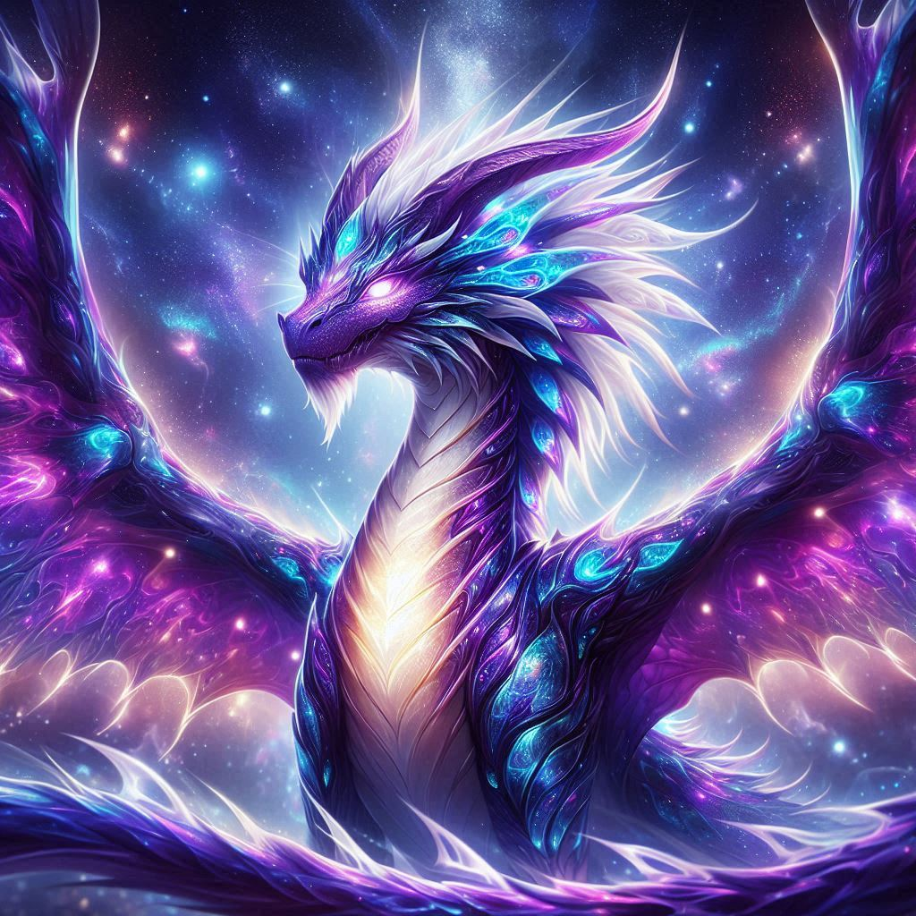 Un dragón de cuerpo largo y serpentino, con escamas de tonos dorados, blancos y plateados, que forman una especie de armadura adornada con gemas de color turquesa en su cuello, percho y articulaciones, que parecen brillar con luz propia. Sus alas de plumas blancas parecen hechas de luz y energía sólida. Su pecho resplandece con un núcleo solar y su cola termina en un penacho de energía blanca. Su movimiento es fluido, casi flotante, como si nadara en el aire, y cada uno de sus movimientos deja una estela de partículas luminosas en el aire.