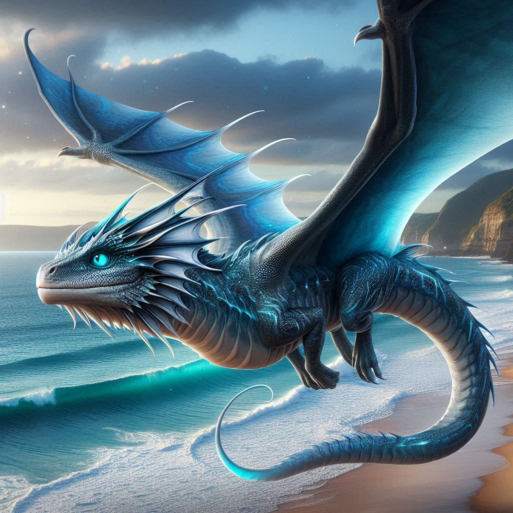Un dragón anfibio de aspecto hidrodinámico, que recuerda la de un antiguo depredador marino, con cuerpo alargado y musculoso cubierto de escamas que van del azul profundo al plateado, con patrones brillantes a lo largo de su cuerpo y alas, y escamas más grandes y claras en el pecho. Su piel parece húmeda, reflejando la luz como un pez. Tiene branquias visibles en los costados del cuello y una aleta dorsal que recorre la espalda hasta una cola similar a la de una ballena. Sus alas parecen aletas membranosas reforzadas con hueso, diseñadas tanto para nadar como para planear. Sus ojos son de color turquesa penetrante y luminoso, con pupilas horizontales, y posee un hocico afilado de reptil con delicadas protuberancias similares a plumas alrededor de su cabeza. Adicionalmente, los dragones más viejos suelen tener crecimientos coralinos o algas adheridas a su piel.