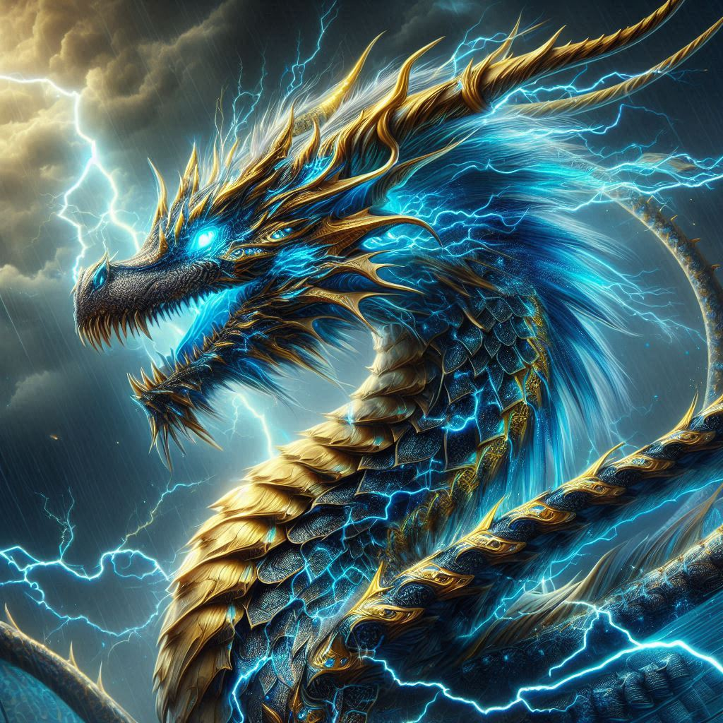 Un dragón majestuoso de escamas intrincadas azules y doradas, con un brillo metálico, y envueltas en chispas eléctricas. Su piel parece vibrar con electricidad, y su cuerpo está lleno de marcas fractales que brillan como circuitos eléctricos. Sus alas tienen membranas semitransparentes con venas luminosas que centellean como relámpagos, y su cola termina en una punta bifurcada que descarga rayos. Sus ojos son incandescentes, de color blanco o azul, sin pupilas visibles. Dos grandes cuernos puntiagudos se proyectan hacia atrás, actuando como pararrayos naturales.